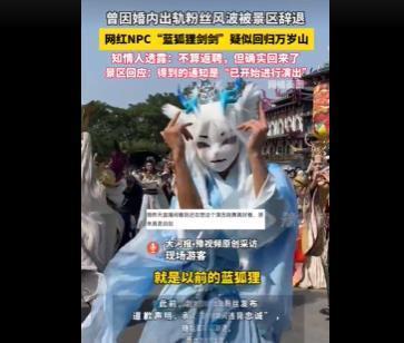 近日,有网友在河南开封万岁山武侠城仙侠广场音乐节附近,拍到曾因婚内出轨风波被辞退的网红NPC“蓝狐狸剑剑”。视频中,他身着二次元风格装扮巡游互动。此前,剑剑因婚内出轨粉丝风波遭万岁山景区辞退。此次该NPC复出再次掀起争议。11月12日下午,万岁山武侠城方面公开回应,面对广大游客的反馈,经与剑剑本人深入沟通并达成一致后,双方共同决定:即日起,剑剑离开景区并停止在景区的一切工作事宜。