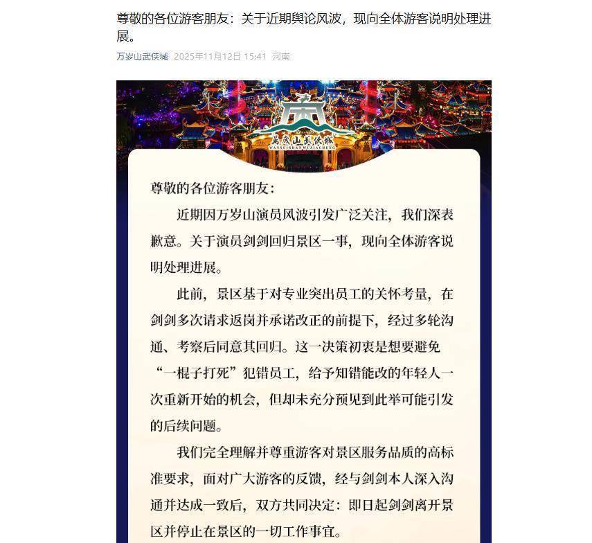 万岁山武侠城方面对近期这场舆论风波表示,此前,景区基于对专业突出员工的关怀考量,在剑剑多次请求返岗并承诺改正的前提下,经过多轮沟通、考察后同意其回归。这一决策初衷是想要避免“一棍子打死”犯错员工,给予知错能改的年轻人一次重新开始的机会,但却未充分预见到此举可能引发的后续问题。